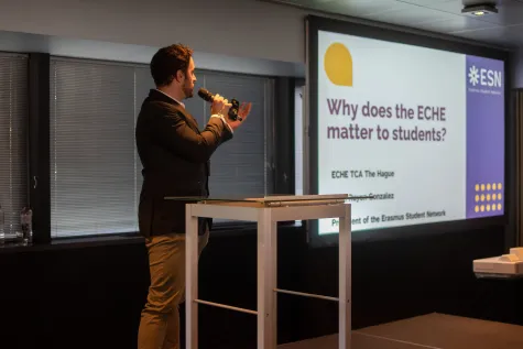 Juan Rayon Gonzalez, voorzitter van ESN International, nam deelnemers mee in een studentenonderzoek van het Erasmus Student Network (ESN): “ECHE is voor studenten een boost van inclusie, betrokkenheid en innovatie. Het is een stappenplan zonder limiet.” Hij gaf de hoger onderwijsinstellingen direct tips over hoe zij studenten kunnen betrekken in de opzet, implementatie en evaluatie van ECHE gerelateerde initiatieven.